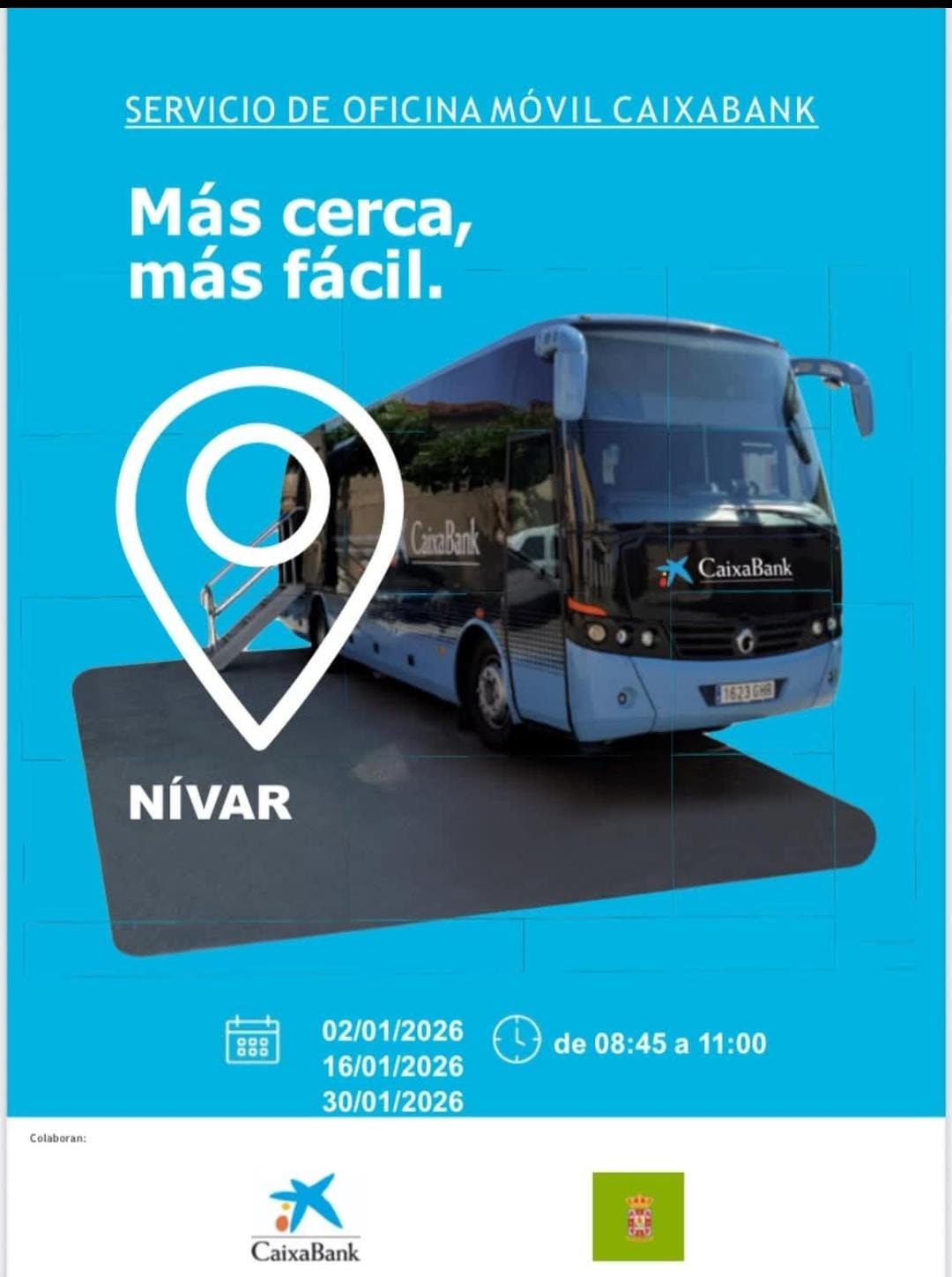 informamos que el Ofibus de Bankia estará situado en el Mirador de Nívar los próximos Viernes 2, 16 y 30 de Enero para prestar los servicios habituales, en horario de 8:45 a 11:00 horas.